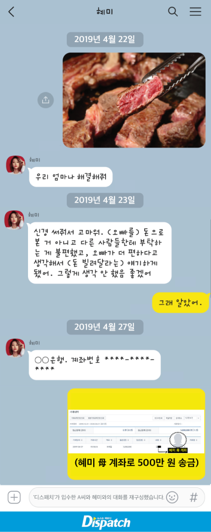 A씨는 혜미의 생활비까지 지원했다. “아직 정산을 받지 못해 생활비가 부족하다”며 “하루, 또는 이틀에 한 번씩 돈을 빌려 달라고 했다”며 이체명세를 공개했다.