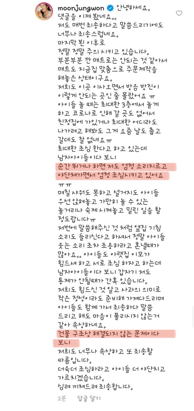 아랫집 이웃의 층간소음 호소에 대해 직접 사과하기도 했다.