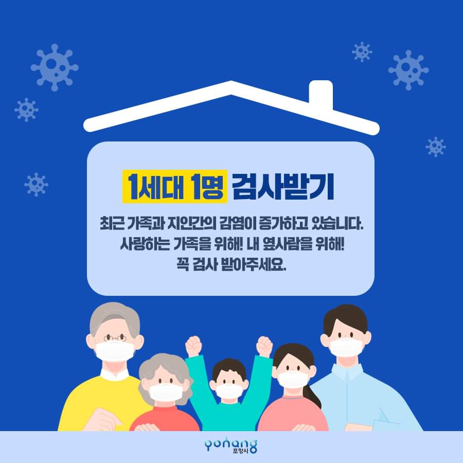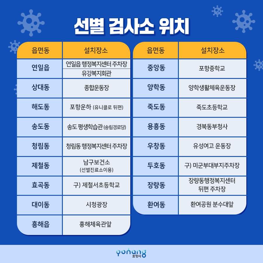 또한 포항 전역의 일반 휴게음식점(카페 식당 등)과 죽도시장 상인·온천과 목욕탕 종사자와 정기 이용자·이미용종사자들도 전원 검사를 받아야 한다.