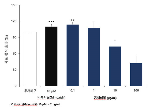 연구진은 콩제비꽃 추출물 0.1㎍/㎖를 모유두세포에 처리했을 때 모유두세포가 증식한 것을 확인했다. 현재 발모제로 쓰이는 미녹시딜 2㎍/㎖의 효과와 비슷하거나