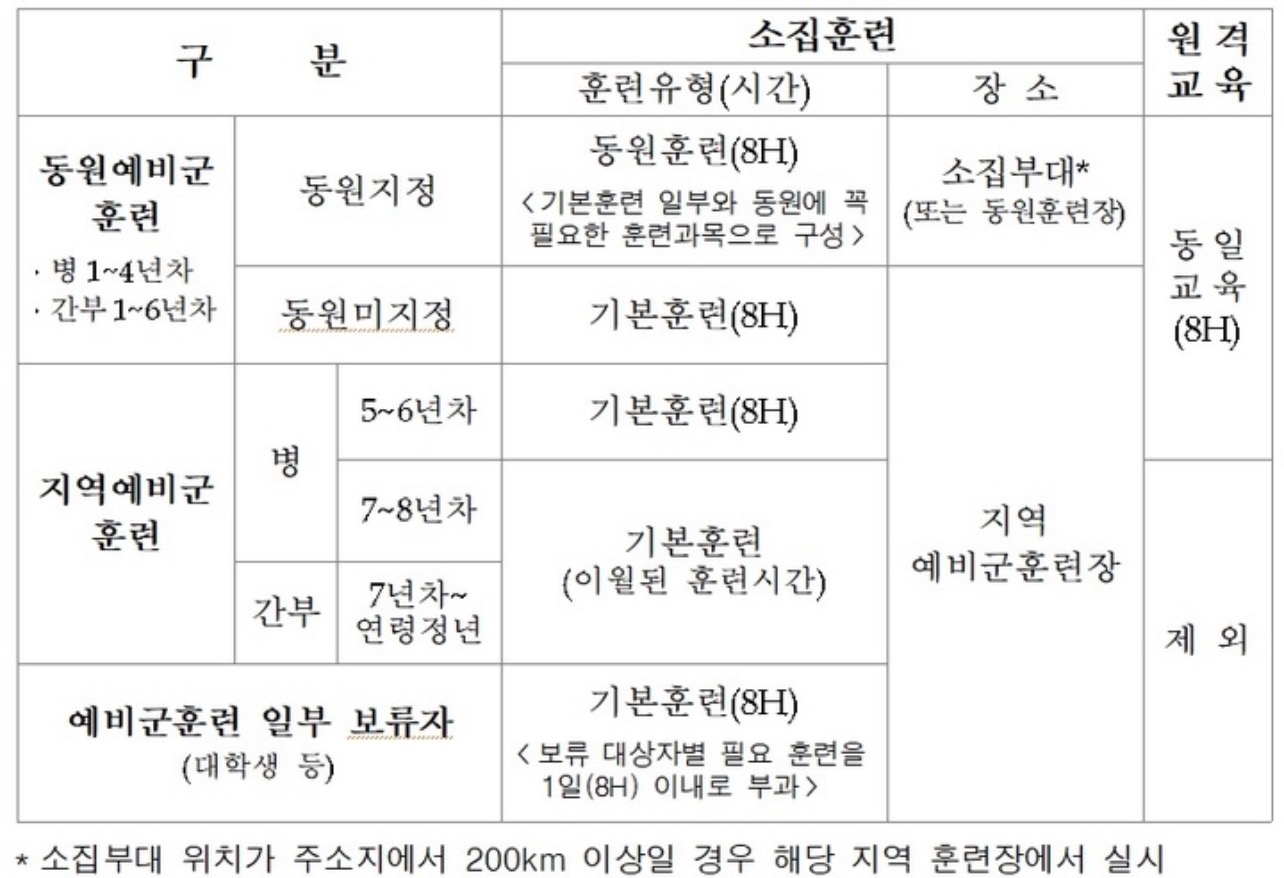 예비군 소집훈련은 예비군 편성기간(8년) 중 1∼6년차까지 부과되는데, 1∼4년차 중 동원지정자는 2박3일 동원훈련을, 동원미지정자는 출·퇴근 방식 4일(32시간)이나 2박3일 훈련을 이수해야 한다. 5∼6년차 예비군은 기본훈련(8시간)과 전·후반기 작계훈련(12시간)을 이수해야 합니다.