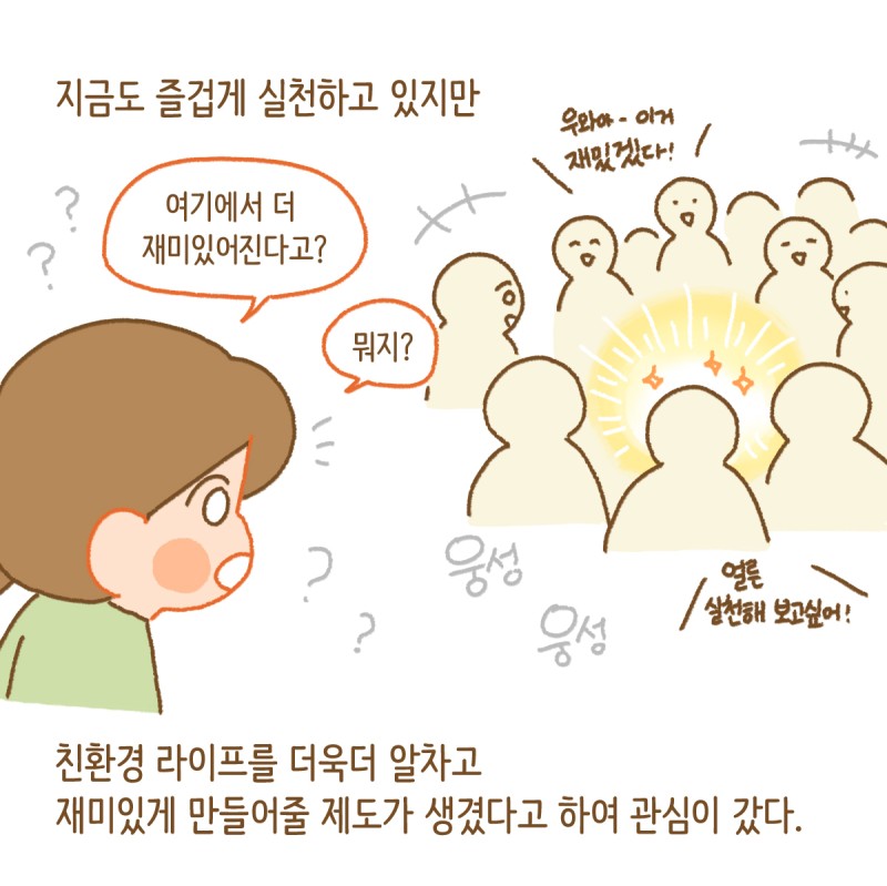 세부적인 실천활동은 종이영수증 대신 전자영수증 간편하게 발급받기, 리플스테이션에 방문해서 화장품/세제 리필받기, 다회용기를 사용해 배달받기, 무공해차 대여하기, 그린카드로 친환경제품 구매하기 등 6가지입니다. 이를 통해 탄소배출은 줄이고, 포인트는 늘리는 혜택을 제공해 기후변화에 대응하는 생활습관에 대한 국민참여를 지원하고자 합니다.