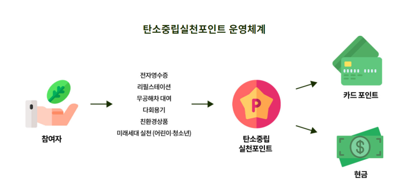 탄소중립 실천포인트는 일상생활 속에서 탄소중립 생활을 실천하면 경제적 혜택을 제공하는 제도로, 일반국민의 탄소중립 생활실천문화 확산을 위하여 다양한 민간기업의 친환경활동 이용 시 이용실적에 따라 인센티브를 지원합니다.