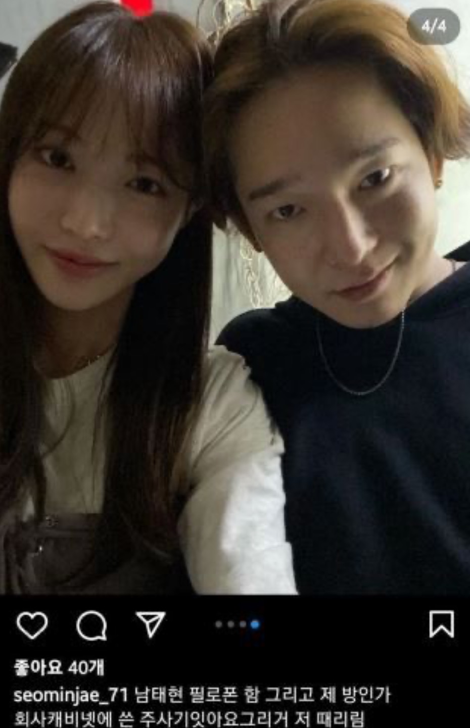 서민재는 이날 인스타그램에 “남태현 필로폰 함. 그리고 제 방인가 회사 캐비넷에 쓴 주사기가 있어요. 그리고 저 때림”이라는 글과 함께 남태현과 얼굴을 맞대고 있는 투샷을 올렸다.