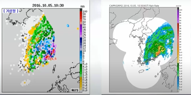 왼쪽의 사진은 우량계를 통해 관측한 강수량의 분포도이며 오른쪽 사진은 레이더를 통해 관측한 강수량의 분포도입니다. 왼쪽의 우량계로 관측한 분포도의 경우 공간 해상도가 다소 떨어지지만 정확하다는 장점이 있습니다. 반면, 오른쪽의 레이더로 측정한 분포도 같은 경우 고해상도의 레이더 격자 강수가 추정되어 보다 정확하고 상세하게 강수 정보를 분석할 수 있다는 장점이 있습니다.