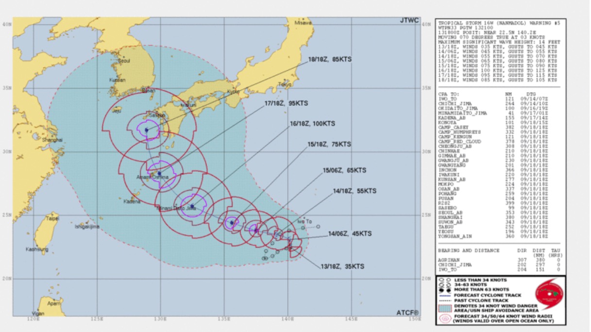 (제 14호 태풍 난마돌(NANMADOL) 예측 경로 사진 미국합동태풍경보센터(JTWC))
