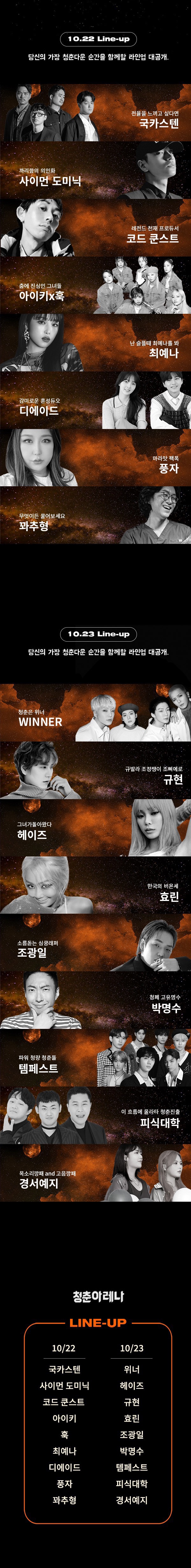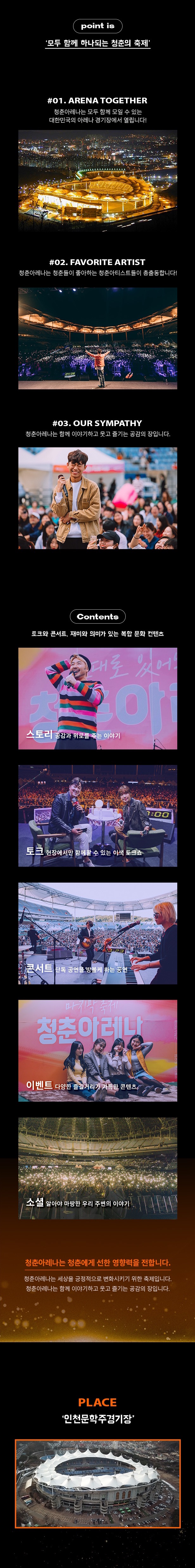 대한민국 유명 아티스트들이 총출동해서 매년 많은 사랑을 받고있으며 라인업 출연진 가수들의 음악을 듣기도 하고 스토리 토크, 다양한 이벤트, 소셜 등으로 함께 이야기까지 할수있는 공감의 장이 펼쳐지는게 인천 청춘 아레나의 특징 입니다.