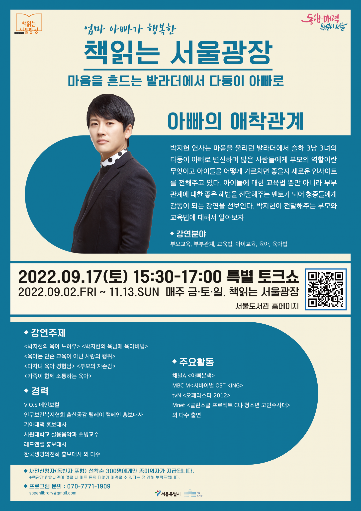 아이들 교육법, 부부관계에 대한 해법 등 다둥이 아빠의 현실적인 육아 노하우를 9월 17일(토) 15:30에 만나보시길 바랍니다.