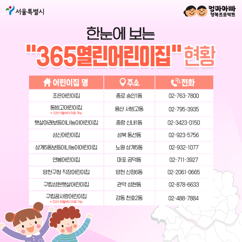 조은어린이집, 동빙고어린이집, 햇살아래보듬이나눔이어린이집, 성신어린이집, 상계5동보듬이나눔어린이집, 연봉어린이집, 양천구청직장어린이집, 구립성현햇살어린이집, 구립꿈사랑어린이집(22년 10월부터 이용 가능)