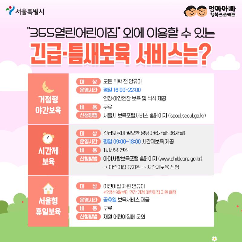 '엄마아빠 행복프로젝트'의 틈새보육 SOS서비스 중 하나로 휴일, 야간 일시 보육서비스를 제공하는 365열린어린이집을 7개소에서 9개소로 확대 운영합니다.
