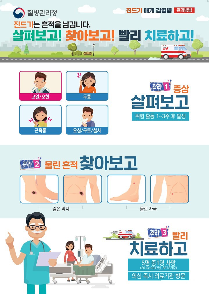 야외작업 활동 시 작업복 (긴팔, 긴바지, 모자, 목수건, 토시, 장갑, 양말, 장화) 착용, 농경지 및 거주지 주변 풀숲 제거, 풀숲에 옷을 벗어 놓지 않고 휴식 시 돗자리 사용, 야외작업 활동 후 작업복 세탁하기, 귀가 즉시 목욕, 샤워를 하는 등 예방수칙을 준수하여야 합니다. 물리지 않게 조심하시고 의심되면 즉시 병원으로 가세요