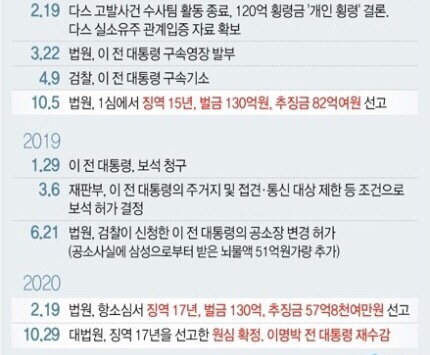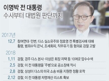 이 전 대통령은 자동차 부품회사인 다스 회삿돈 약 349억원을 횡령하고 삼성전자가 대신 내준 다스의 미국 소송비 119억여원을 포함해 모두 163억원가량의 뇌물을 챙긴 혐의 등으로 재판을 받아왔다.