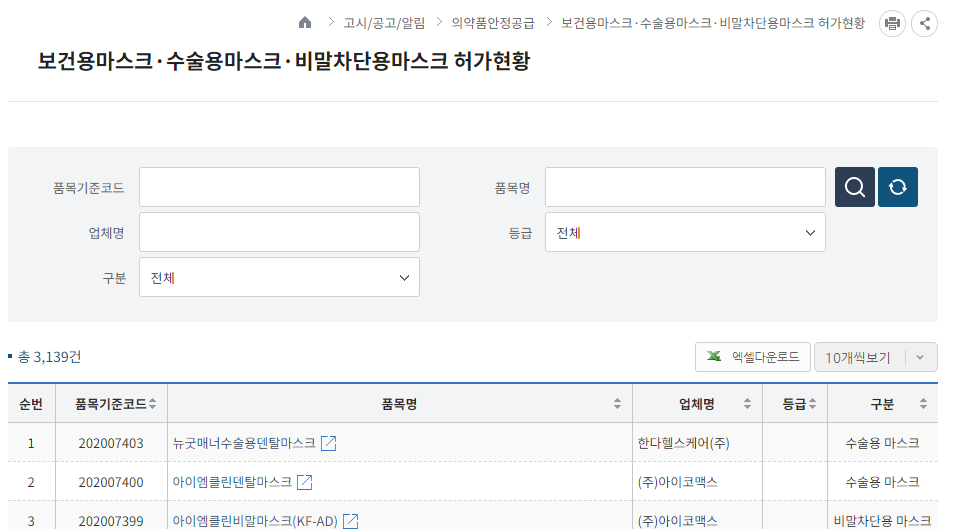 허가받은 마스크라면 내역이 나타납니다.