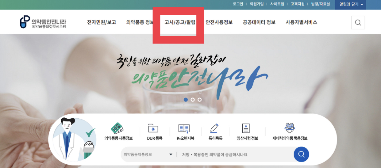 의약품 안전나라 접속 > 고시/공고/알림 클릭 >