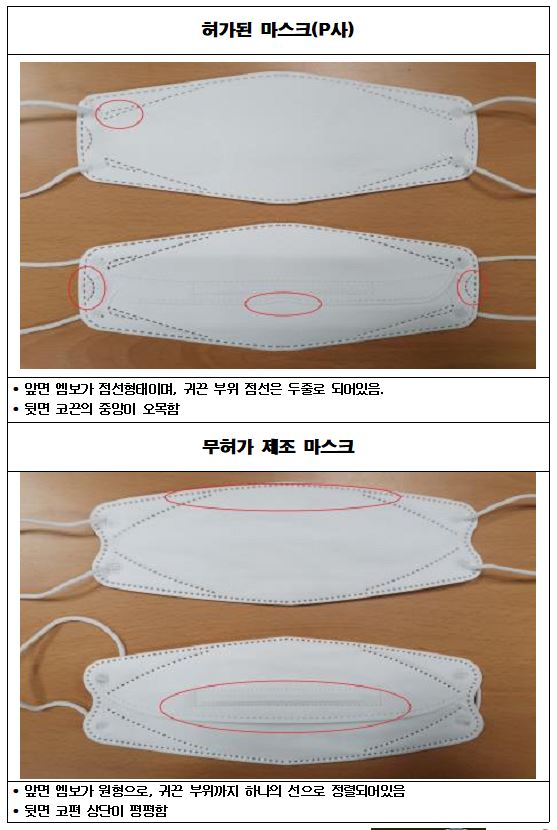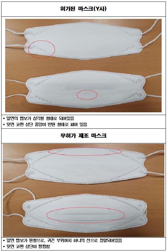 무허가 마스크는 앞면의 엠보가 뾰족하거나