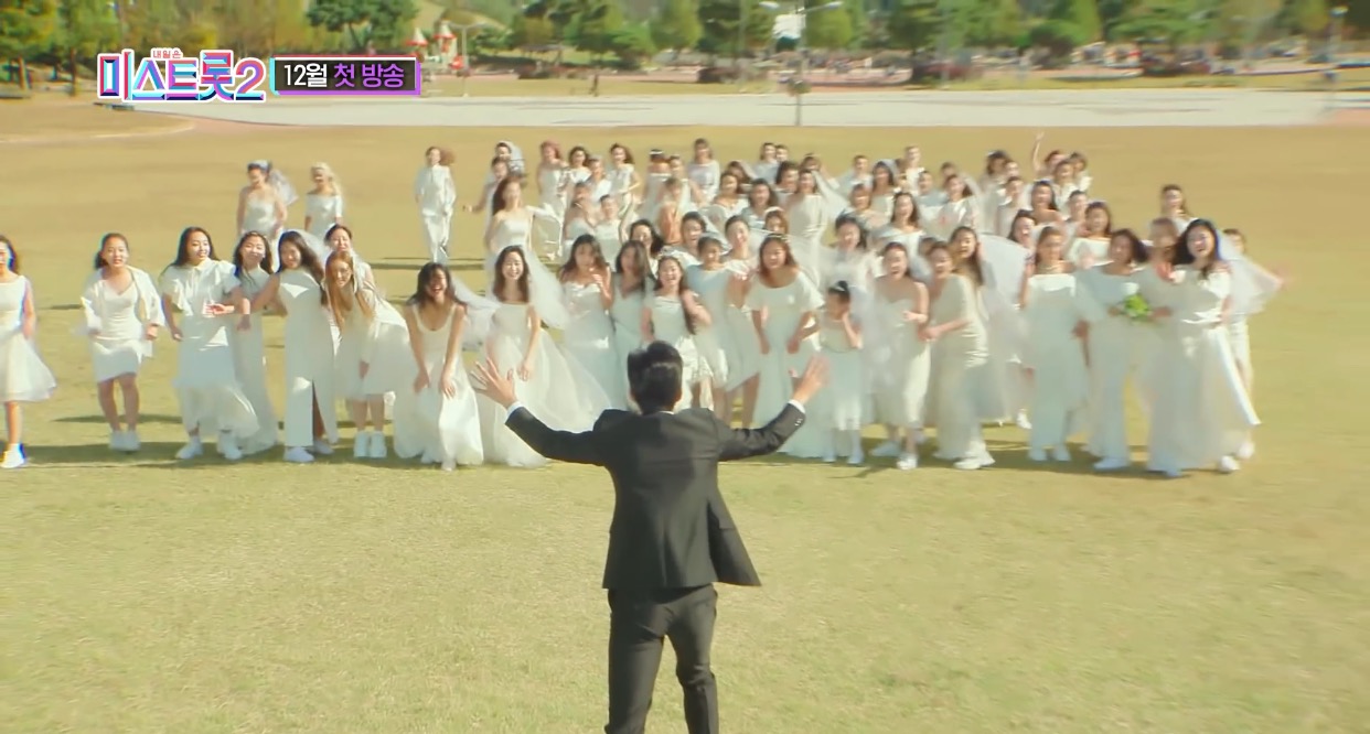 임영웅 뒤로 순백의 웨딩드레스를 입은 한 무리의 여성들이 “영웅아 나도 진 하고 싶어!”라고 외치며 필사적으로