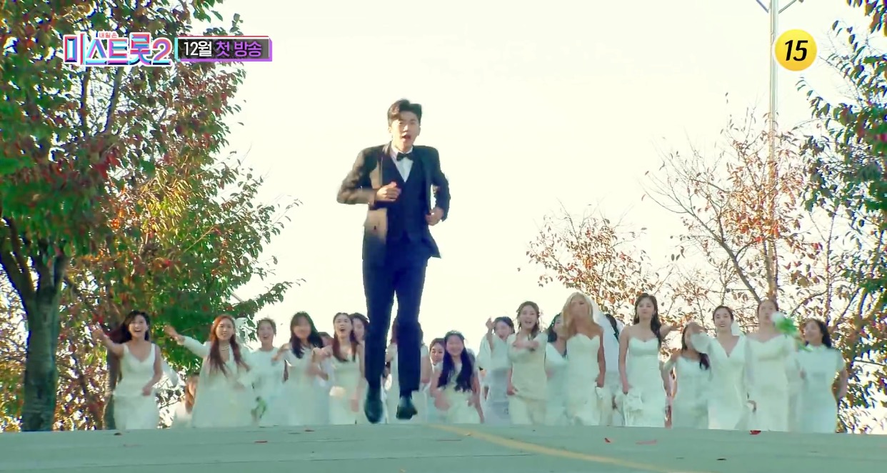 임영웅은 쫒기다가 결국 “잠깐”을 외치며 멈춰선 임영웅은 자신을 쳐다보는 100인의 트롯걸과 순간 대치 상태로